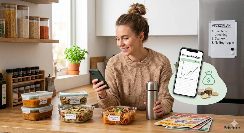 Innan du går och storhandlar nästa gång: Ta en bild av ditt kylskåp och skafferi. Utmana dig själv att laga tre middagar på enbart det du redan har hemma. Det sparar i snitt 400–600 kr i månaden och minskar matsvinnet drastiskt.